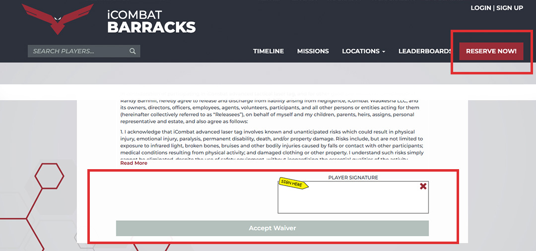 Go to Barracks and click on Sign Up in the top right corner. From here you will create your username, password, and select iCOMBAT Waukesha as your location.
