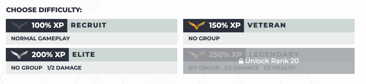 Select your difficulty. New players will start at Recruit, and as you play more and gain rank, you can choose Veteran, Elite, and Legendary!
