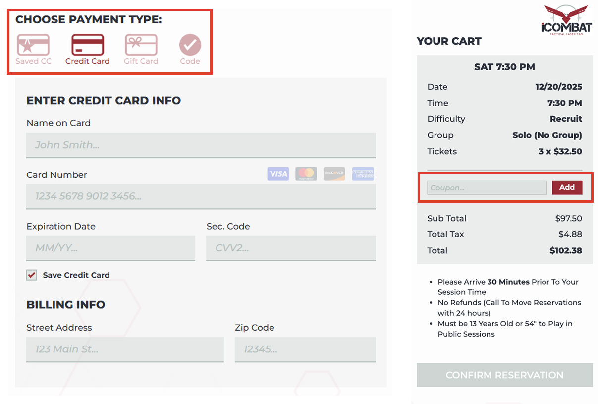 The final step, payment. You can choose from different payment options, including Credit Card, Gift Card, or Reservation Code.